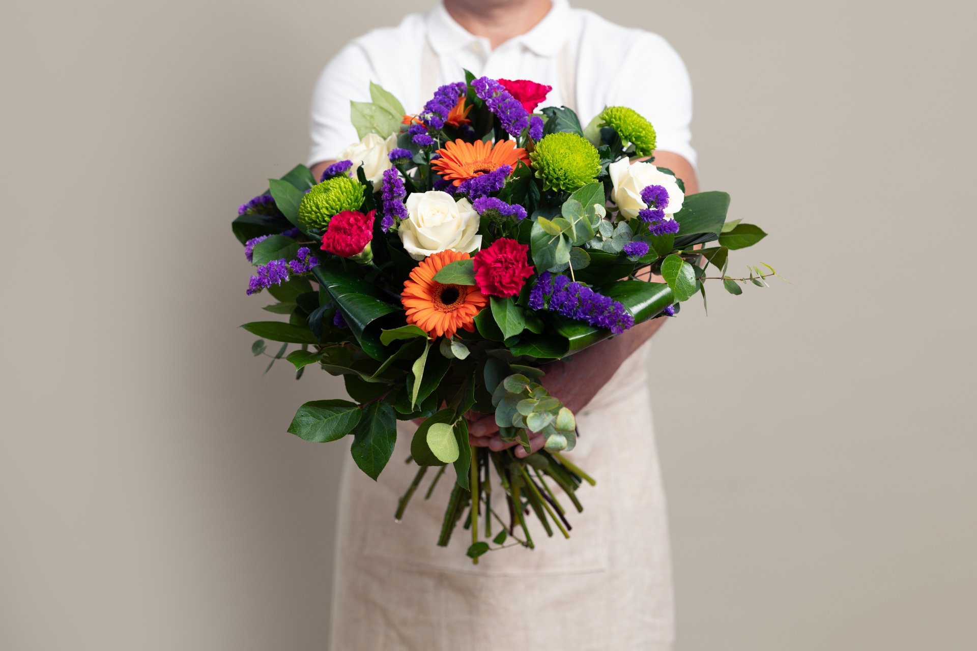 Vibrant, expressive, and full of joy. Featuring Orange Gerberas, Cerise Carnations, Red Roses and more, this hand-tied bouquet is crafted for birthdays, celebrations, and uplifting any space. A popular choice for professionals who want colour with polish.