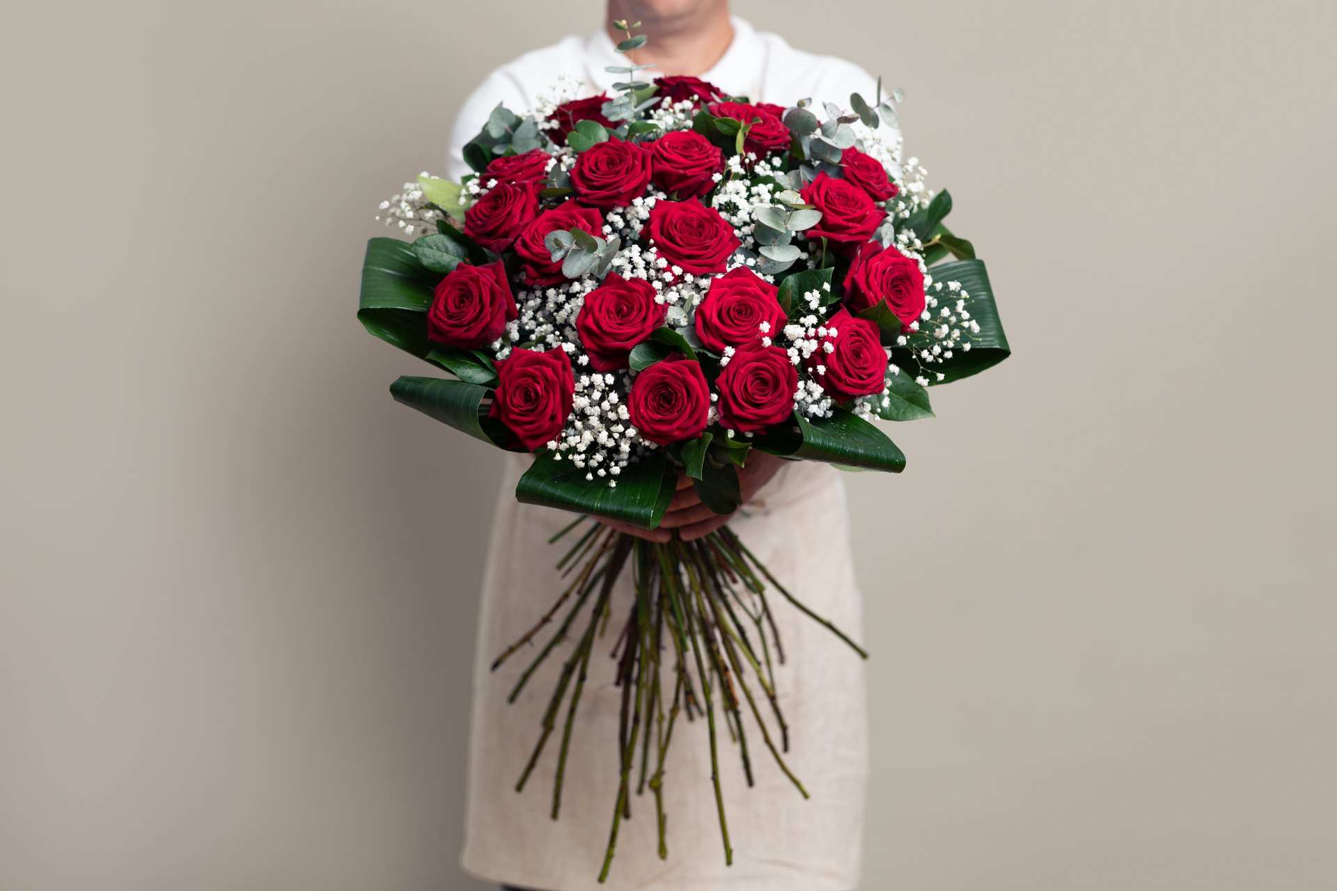Twenty Naomi Red Roses (80cm) create a dramatic display, offset by generous greenery and soft Gypsophila. Ideal for significant moments — from proposals to premium gifting.